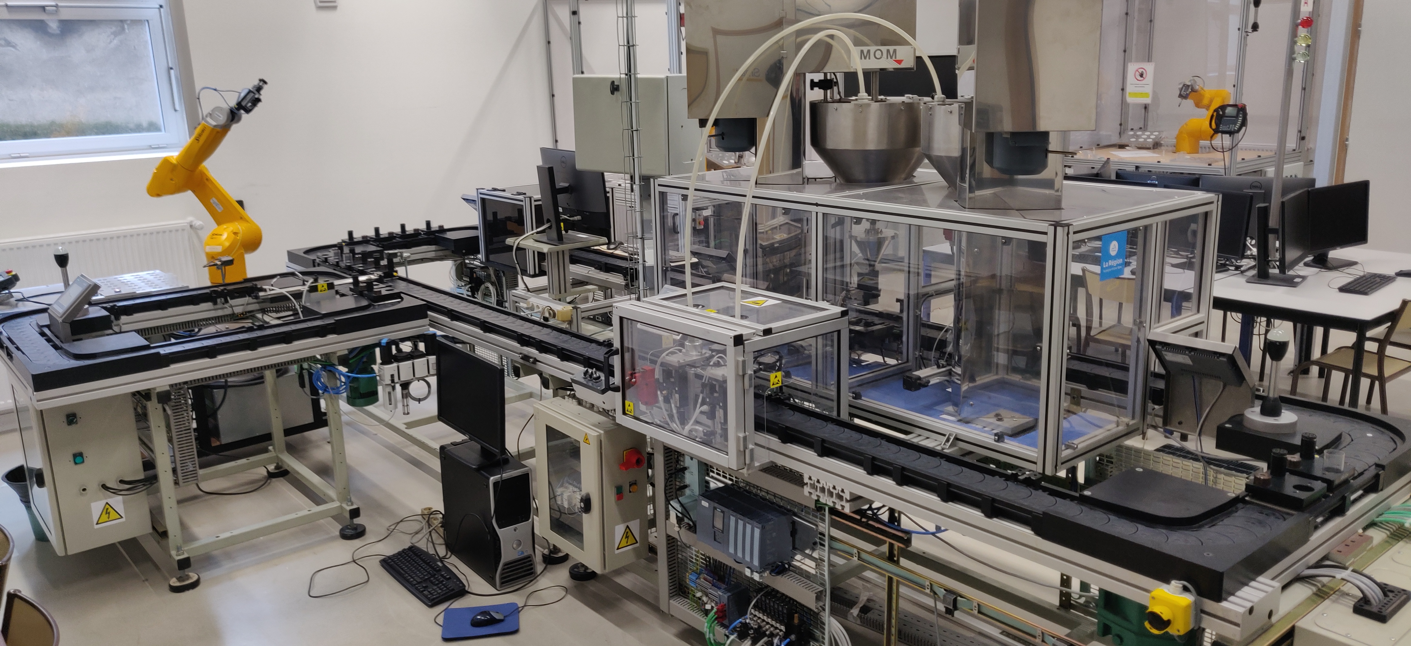 - L'atelier MEXIA comprend deux boucles : l'une pour la fabrication de flacons (deux couleurs, deux niveaux de remplissage) et l'autre pour charger/décharger les flacons répartis en lots par cobot industriel.