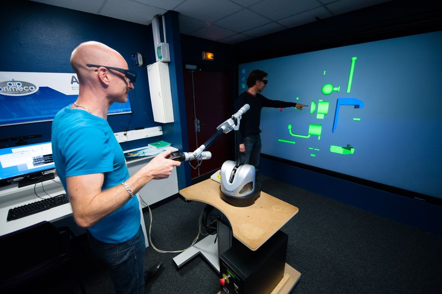 Nous disposons d’une interface haptique à retour de force auquel est associé un écran stéréoscopique rétro-projeté de 3m sur 2m. Lors de manipulation d’objets virtuels dans l’espace 3D, la stéréoscopie immerge les acteurs de manière significative. Un bras à retour d’effort permet la formation d’opérateurs via de l’apprentissage de gestes, le contrôle d’accessibilité ou l étude d’ergonomie de postes de travail. Dans le cadre d’une association avec une interface robotique, il peut être déployé dans des situations à risque pour l’opérateur, ou lors de manipulations sur des sites distants (dans le cadre d’opération chirurgicale par exemple).