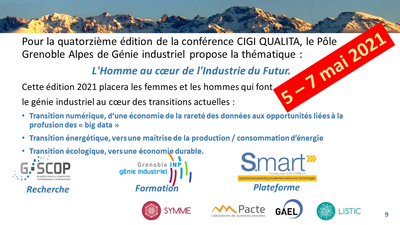 S'appuyant sur les compétences issues des écoles alpines (Grenoble Annecy), A-Raymond, Bosch, Caterpillar Echirolles, Schneider Electric Montmélian, SNR, ST Microelectronics Crolles 300 installent des usines de pointe mettant en œuvre l'industrie 4.0. : l'Usine du Futur et les hommes qui l'opèrent sont ainsi présents au cœur des Alpes. Pour la quatorzième édition de la conférence CIGI QUALITA, le Pôle Grenoble Alpes de Génie industriel propose la thématique : L'Homme au cœur de l'Industrie du Futur. Cette édition 2021 placera les femmes et les hommes qui font le génie industriel au cœur des transitions actuelles : Transition numérique, d'une économie de la rareté des données aux opportunités liées à la profusion Transition énergétique, vers une maitrise de la production / consommation d'énergie Transition écologique, vers une économie durable.